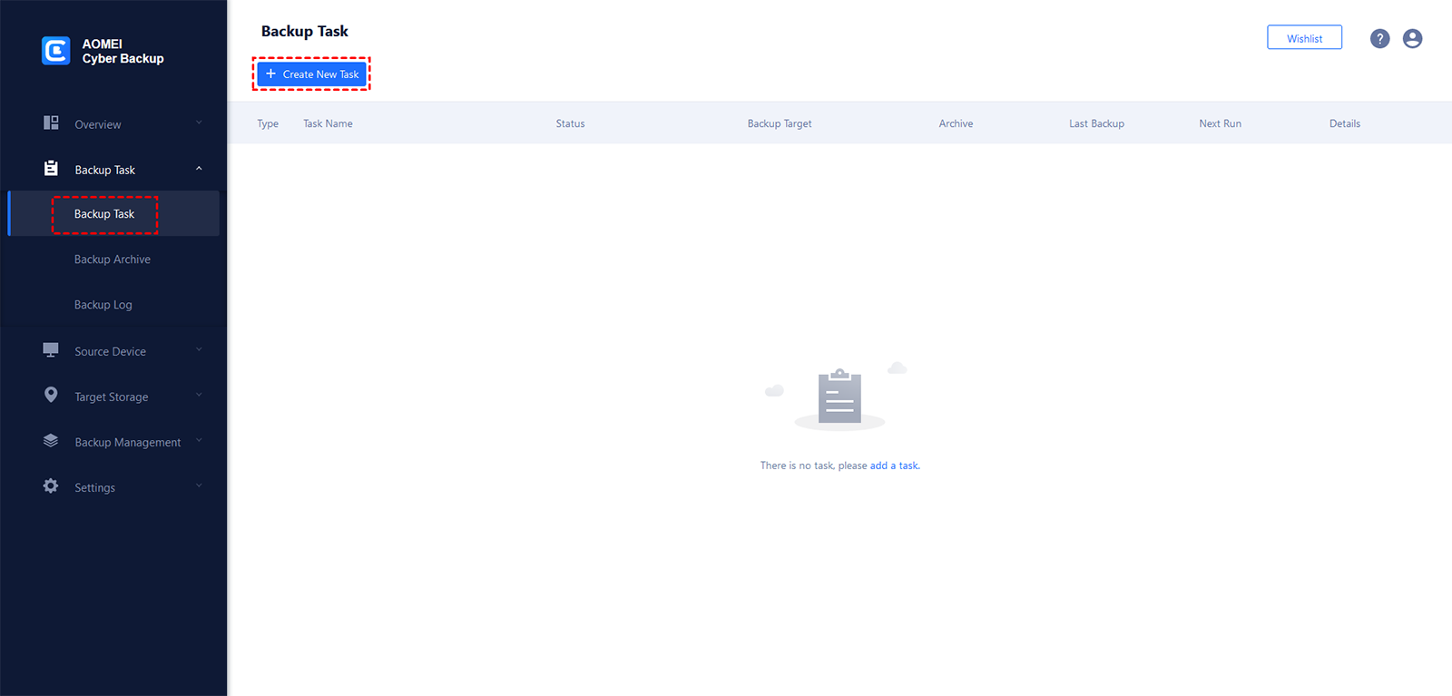 3. Click "Backup Task"-->"Create New Task" to open the task creating page.