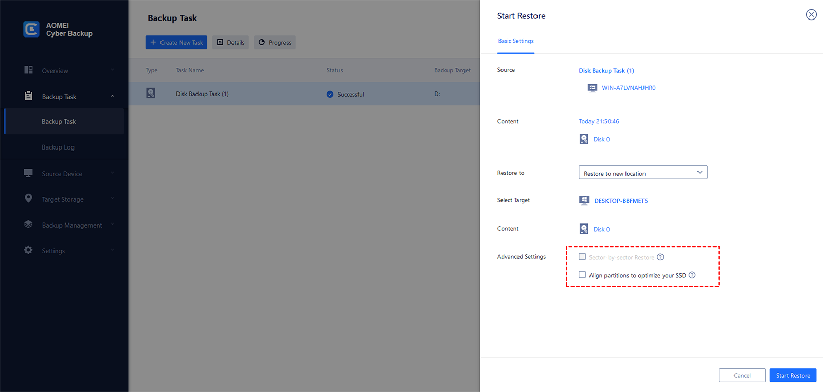 4. You can enable sector-by-sector restore and partition alignment in "Advanced Settings".