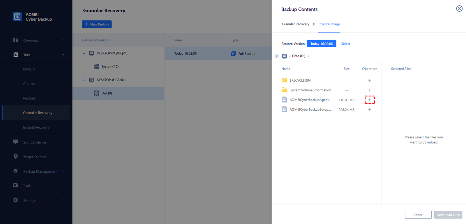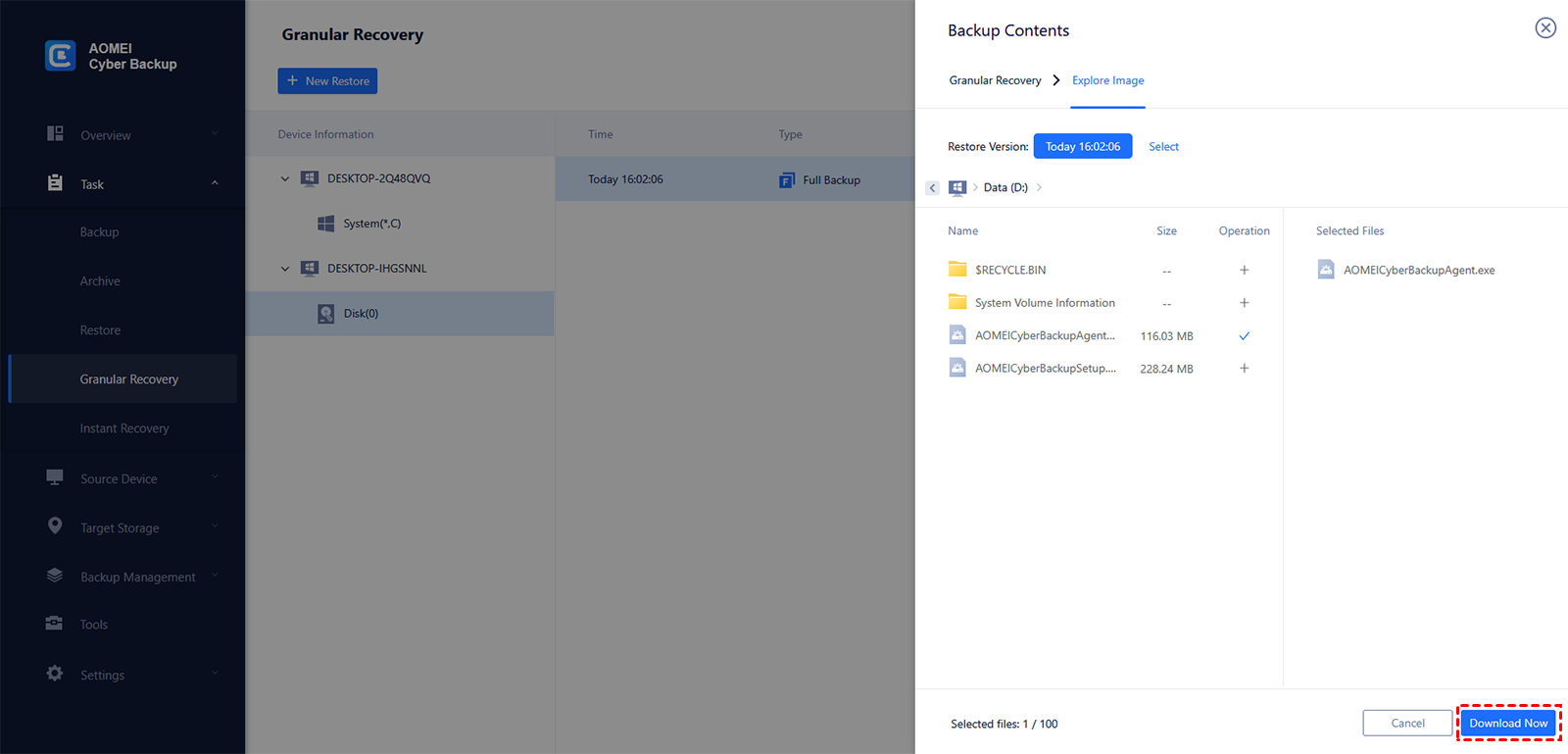 If you only want to restore a certain file from the Windows backup, you can use Granular Recovery. Here we also take Disk Restore as an example.