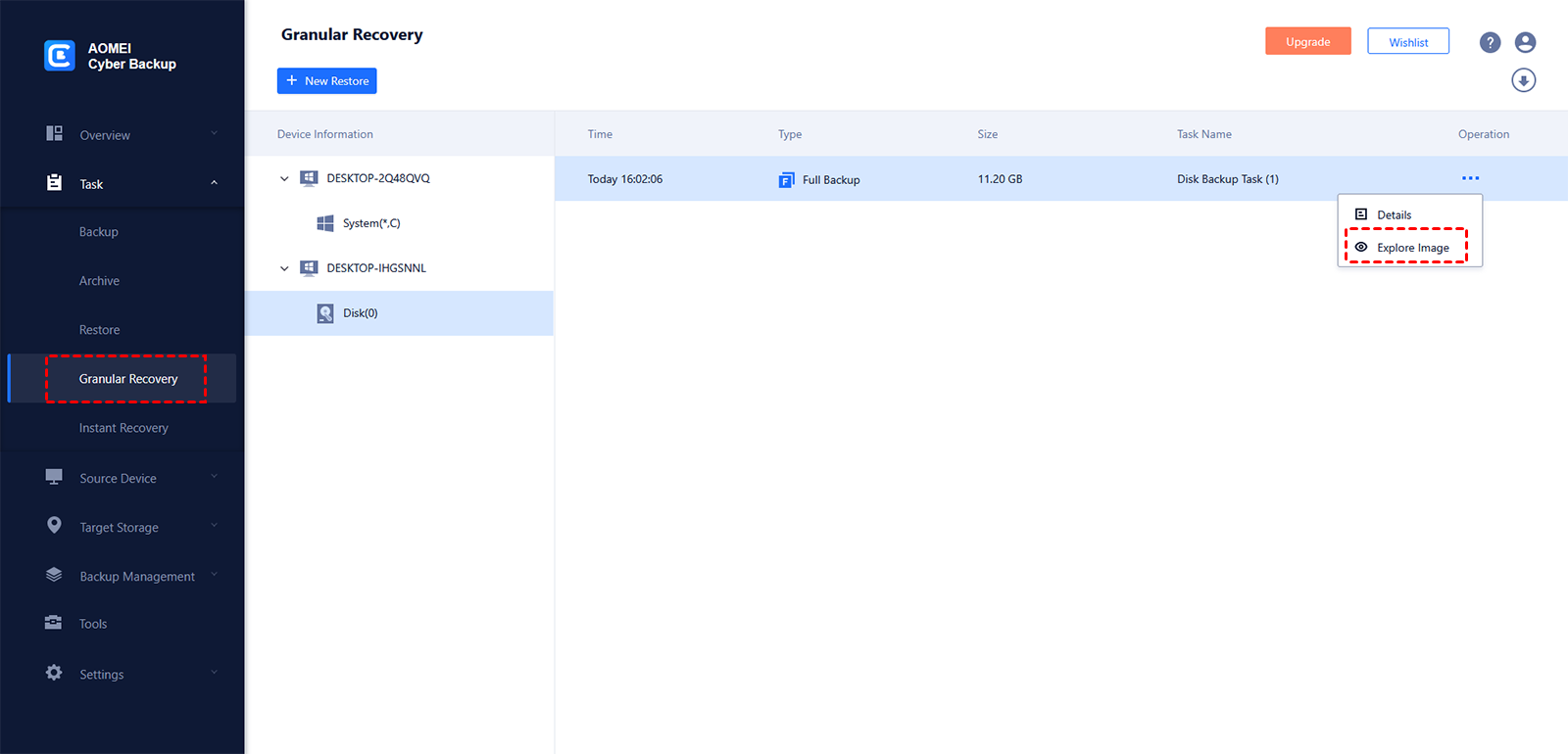 1. Click "Task" on the left menu bar, and choose "Granular Recovery". Locate the task you want to restore, and click ""--> "Explore Image".
