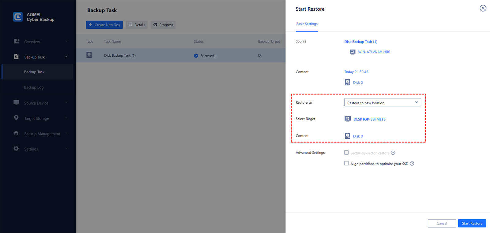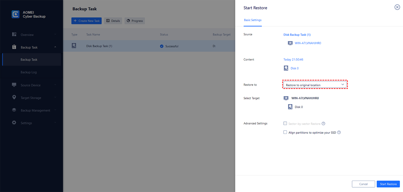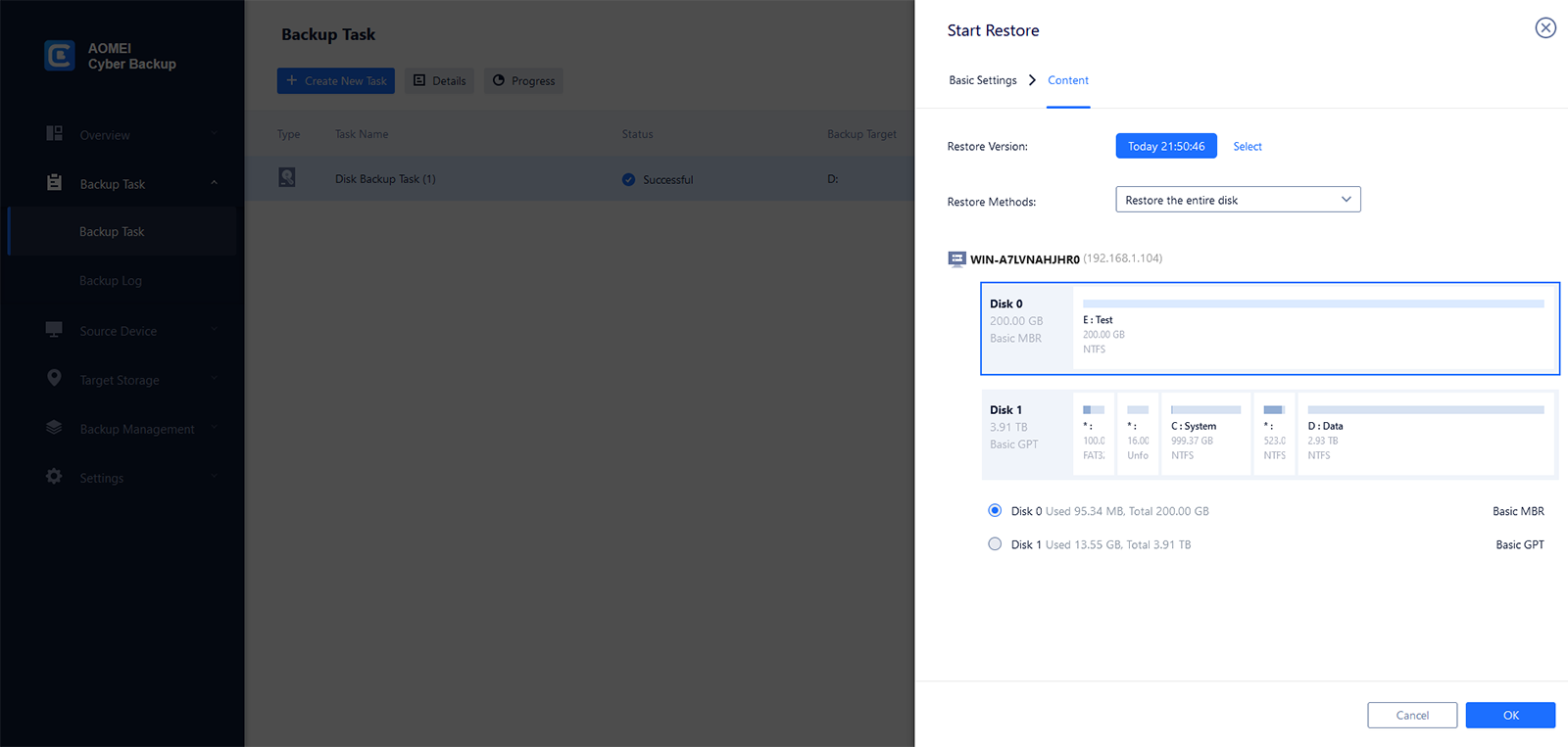 Once you have created backups for your physical machines, you can restore them at any time. Currently, Disk Restore, System Restore and Partition Restore are supported. Here we take Disk Restore as an example.