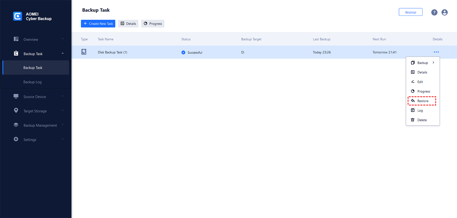 1. Click "Backup Task" on the left menu bar, locate the task you want to restore, and click ""--> "Restore".