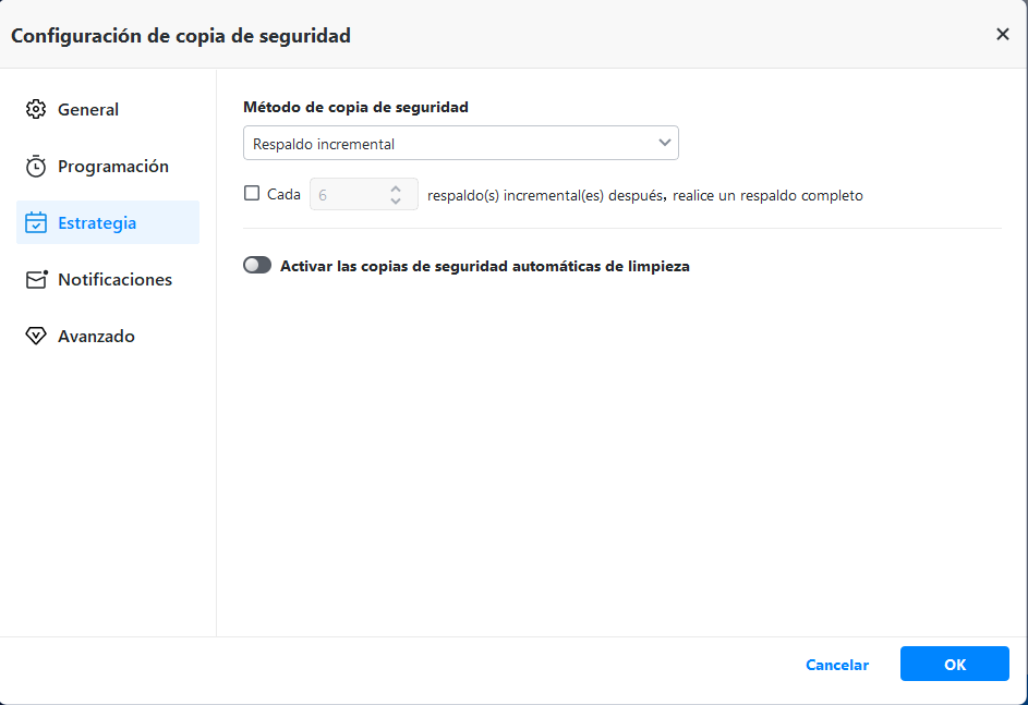 Y puede cambiar fácilmente la copia de seguridad completa, incremental y diferencial seleccionando la opción "Avanzado".