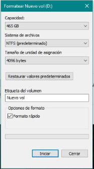 2. Seleccione el sistema de archivos que desee, y recuerde desmarcar la opción de Formato rápido, ya que sólo elimina los archivos de la unidad USB pero no los borra completamente, lo que hace que los datos sean fáciles de recuperar.
