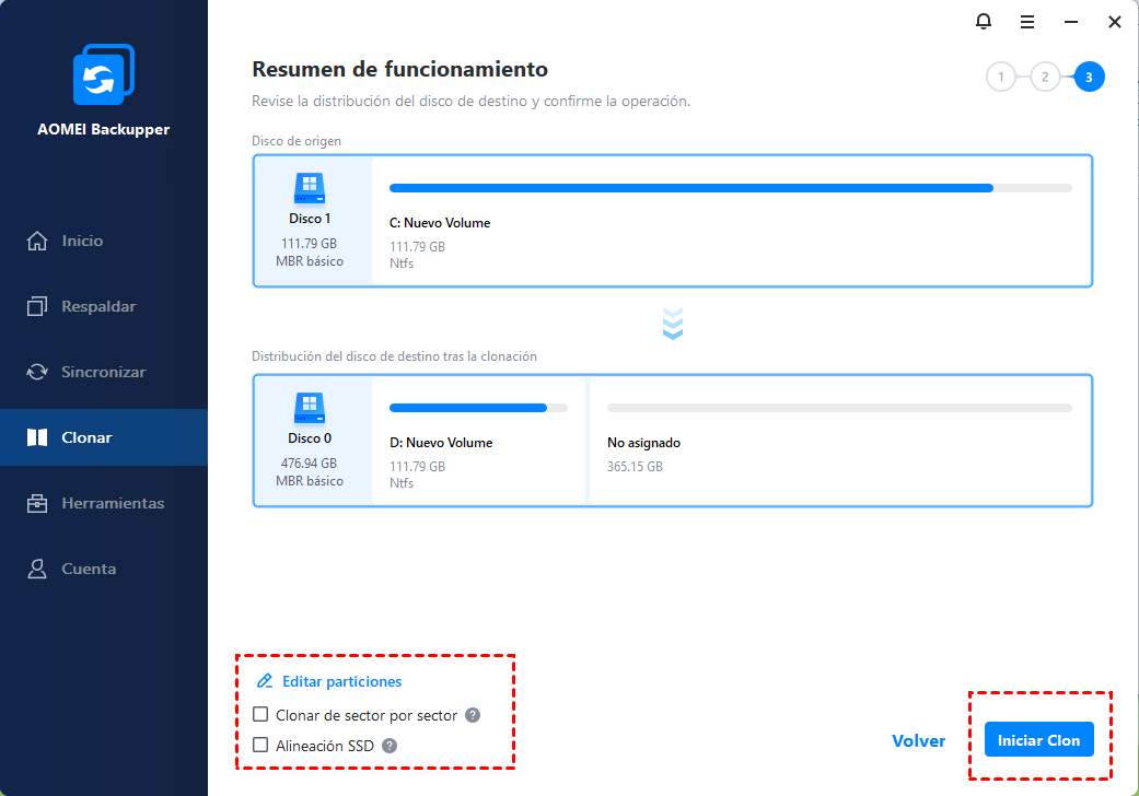 5. Revisa el Resumen del Funcionamiento y haga clic en Iniciar Clon para empezar la tarea.