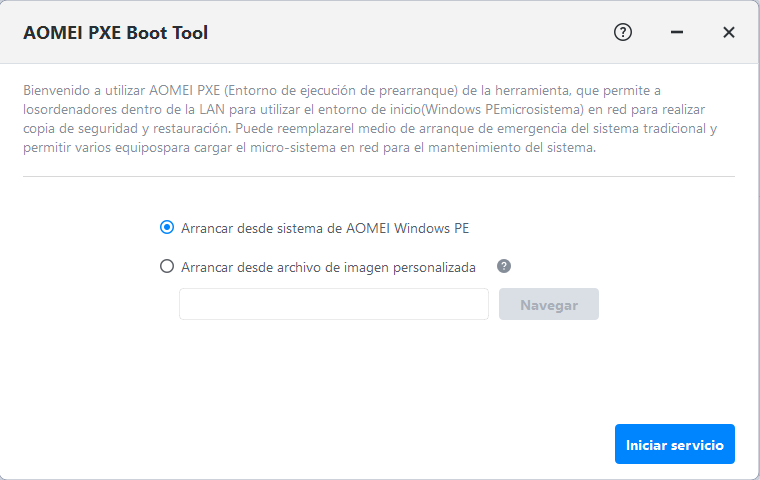 AOMEI PXE Boot Tool está especialmente diseñado para arrancar y mantener de forma segura múltiples ordenadores cliente dentro de la LAN a través de la red. Con él, puede crear directamente un archivo de imagen ISO de arranque de Linux o de Windows PE, y no tiene que pasar mucho tiempo configurando el servidor de arranque PXE.