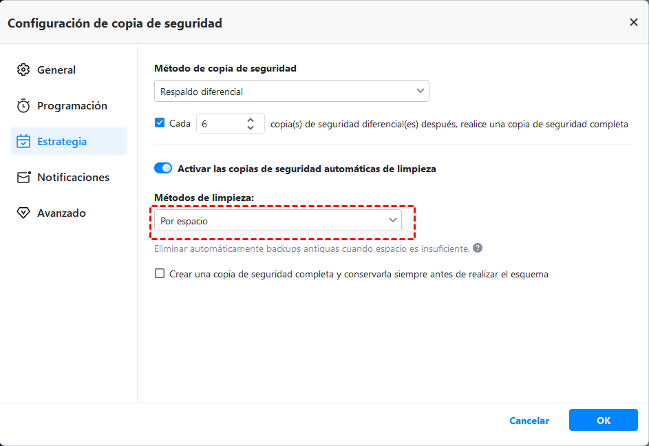 Considere la posibilidad de crear una copia de seguridad programada y el espacio del disco de copia de seguridad es limitado, por lo que se sugiere eliminar automáticamente las copias de seguridad antiguas utilizando métodos de limpieza automática de copias de seguridad. Eliminar manualmente los archivos de la copia de seguridad puede provocar que todas las copias de seguridad posteriores no sean válidas si se trata de una de las copias de seguridad intermedias. También puede probar una copia de seguridad diferencial para evitar este problema. Son características premium en la versión avanzada. Por favor, consulte la página de comparación de ediciones.