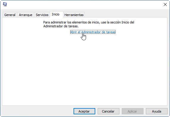 2. En el icono Inicio del cuadro de diálogo Configuración del sistema, haga clic en Abrir el Administrador de tareas.