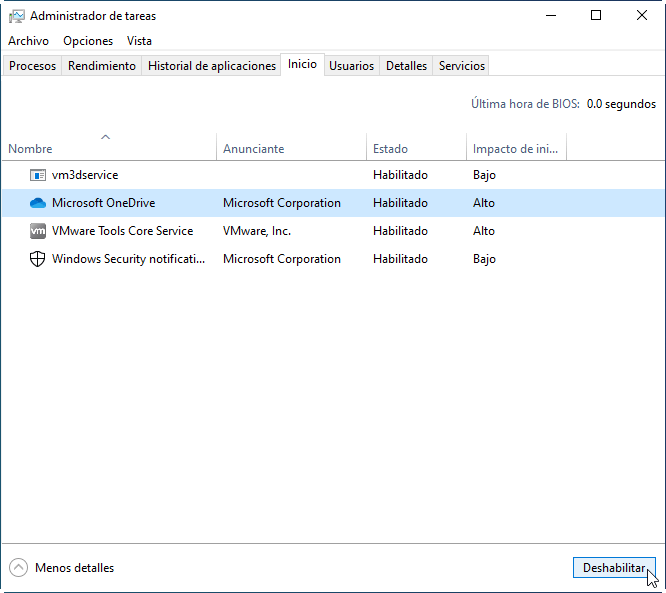 3. En el icono Inicio en el Administrador de tareas, seleccione cada elemento de inicio y luego haga clic en Deshabilitar. Cierre el Administrador de tareas.