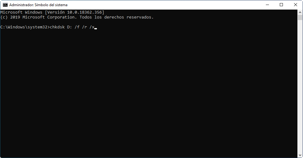 ● El significado de los parámetros usados: “/f” le dice a chkdsk que corrija cualquier error que encuentre; “/r” le dice que encuentre los sectores defectuosos en el disco y recupere información legible; “/x” obliga al disco a desmontarse antes de que comience el proceso.
