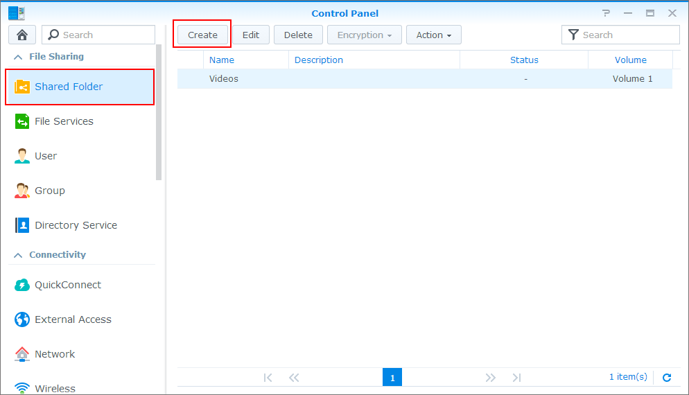 Paso 1. Abre el Panel de Control en la interfaz de web interface y navega a Compartir archivos > Carpeta compartida, y haz clic en Crear para agregar una nueva.