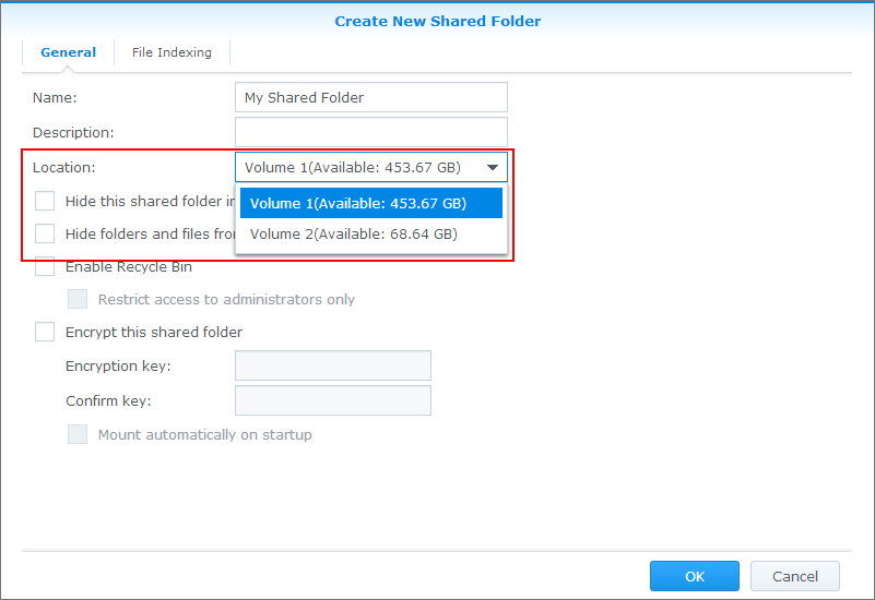 Paso 3. Selecciona un almacenamiento para la carpeta compartida y marca otras opciones, luego haz clic en OK