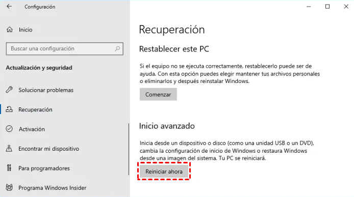 Método 1. Haga clic en el botón Inicio > elija Configuración > seleccione Actualizar seguridad > vaya a la pestaña Recuperación > haga clic en Reiniciar ahora en Inicio avanzado.