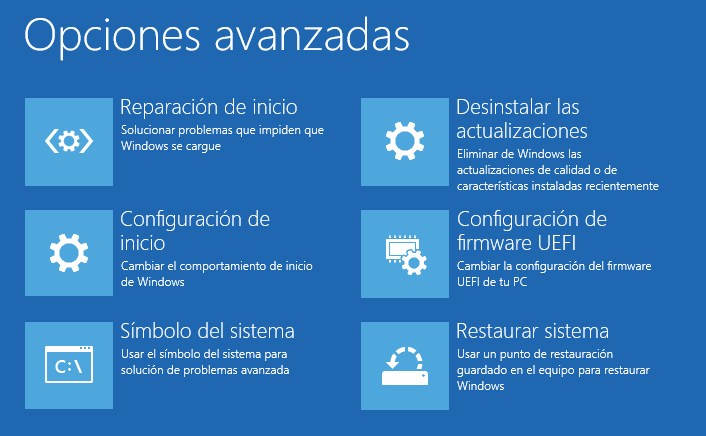 Para hacer uso de las opciones de recuperación como Restaurar sistema, Reparación de inicio, Modo seguro, etc., es necesario entrar primero en el entorno de recuperación de Windows 10.