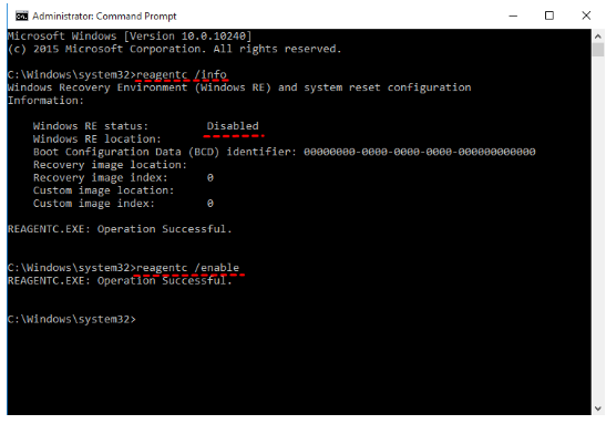 Paso 1. Ejecute cmd como administrador. Luego, escriba reagentc /info para obtener el estado de Window RE.