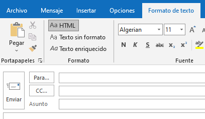 3. En la ventana del mensaje, haz clic en Formato de texto > Texto enriquecido.