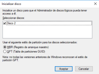 2. Inicialice el SSD para el almacenamiento. Normalmente, el SSD recién comprado no está inicializado y no se puede utilizar para almacenar ningún dato. Para inicializarlo, vaya a la gestión de discos, entonces verá una ventana emergente que le pedirá que inicialice el disco, seleccione el disco y el tipo de disco (MBR o GPT) y haga clic en Aceptar para iniciar el proceso de inicialización.