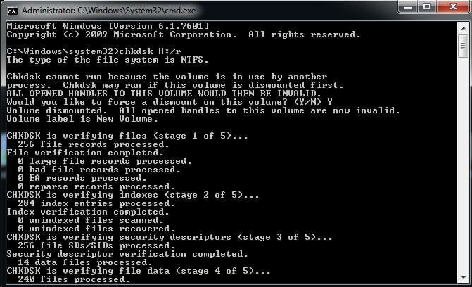 Paso 1. Vaya al símbolo del sistema, escriba chkdsk H: /r y pulse Intro para ejecutarlo.