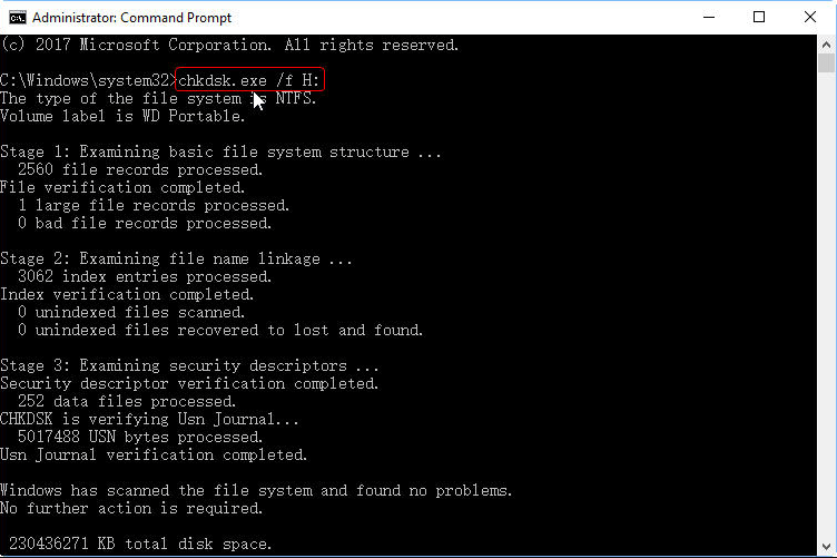 2. En la ventana del Símbolo del Sistema, escriba chkdsk.exe/f H: y presione Enter. Debe reemplazar la "H" con la letra de la unidad de su disco de copia de seguridad.