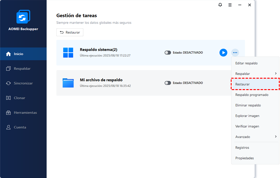 1. Instale y ejecute AOMEI Backupper. Haga clic en "Inicio" en el panel izquierdo, busque la tarea de copia de seguridad del disco y seleccione "Restaurar" en el menú desplegado.