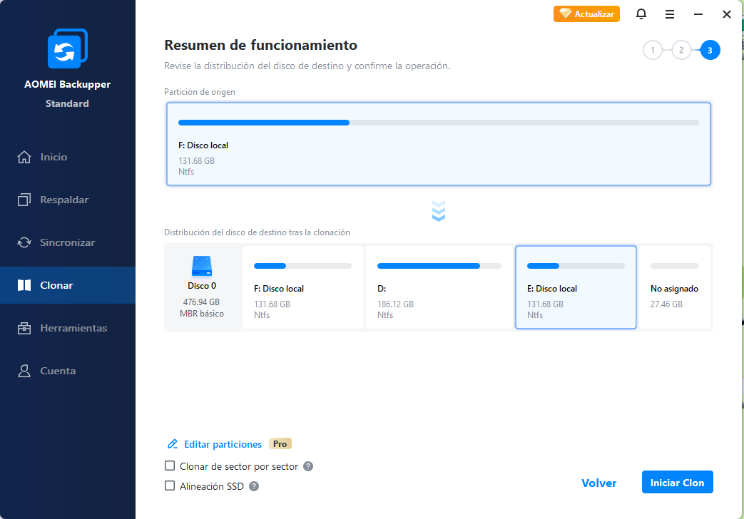 Paso 4. Aquí tienes que confirmar toda la información. Si no hay ningún problema, haz clic en Iniciar clon para iniciar todo el proceso. Si estás clonando una partición de recuperación en un SSD, puedes marcar la casilla frente a "Alineación de SSD" antes de hacer clic en Iniciar Clonación para optimizar el rendimiento del SSD.