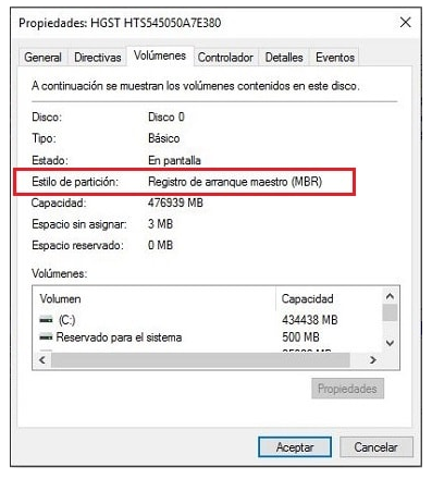 Para comprobar el estilo de partición entre dos unidades, puede ir a la gestión de discos, hacer clic con el botón derecho del ratón en el disco duro o el SSD, elegir Propiedades -> Volumen -> Estilo de partición, entonces verá su estilo de partición, ya sea MBR o GPT.