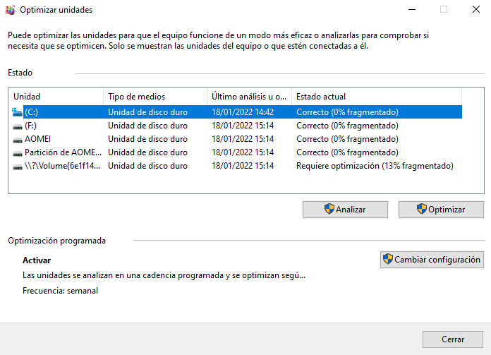 - Desfragmentar y optimizar el disco: esta operación permitirá que el proceso de clonación se realice sin problemas. Escriba "Desfragmentación" en el cuadro de búsqueda, luego seleccione "Desfragmentar y optimizar unidades" y seleccione la unidad que desea analizar y optimizar.