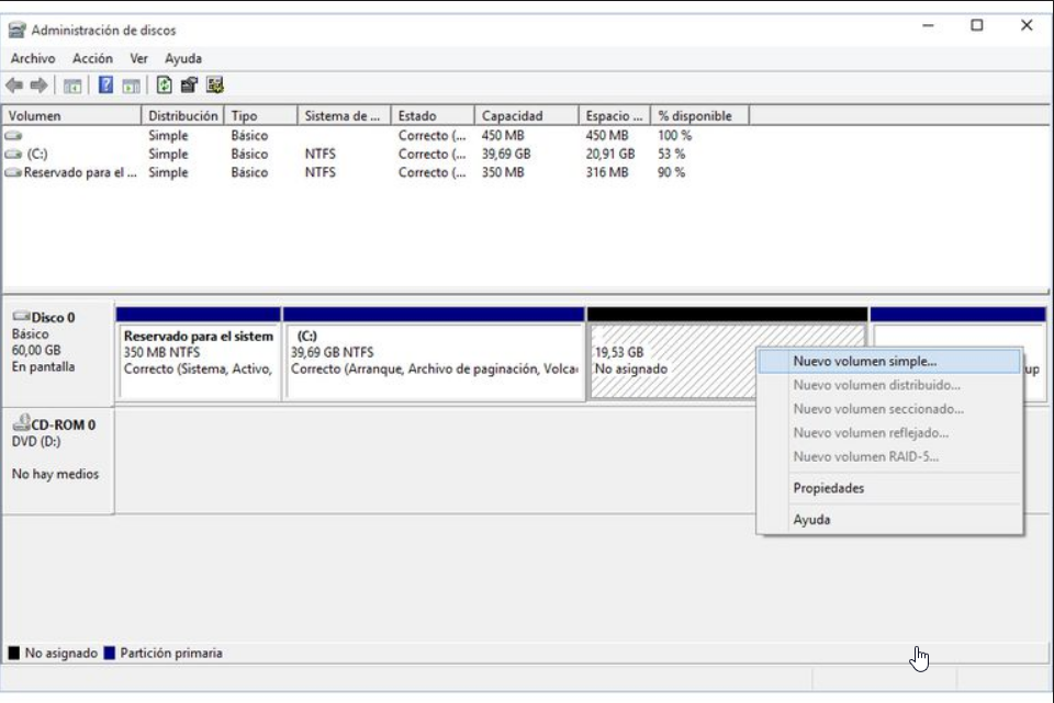Paso 1. Cree una nueva partición simple en el disco 0 con la gestión de discos. Ten en cuenta que la partición reservada del sistema es de 100 MB en Windows 7, 350 MB en Windows 8 y 500 MB en Windows 10.