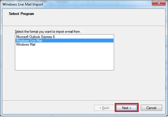 Paso 3. La primera pantalla te pedirá que selecciones el formato desde el cual deseas importar el correo electrónico. Simplemente elige "Microsoft Windows Live Mail" y continúa con "Siguiente".