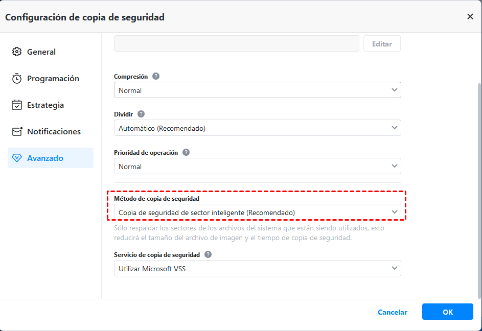 Copia de Seguridad de Sector Inteligente: Sólo respalda los sectores usados del sistema de archivo. Así reducirá el tamaño del archivo de imagen y el tiempo de copia de seguridad.