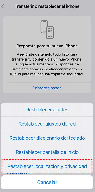Ve a Ajustes > General > Transferir o restablecer el iPhone> Restablecer> Restablecer localización y privacidad > introduce tu código de acceso y haz clic en Restablecer ajustes. Vuelve a conectar tu iPhone al PC para ver tus fotos.