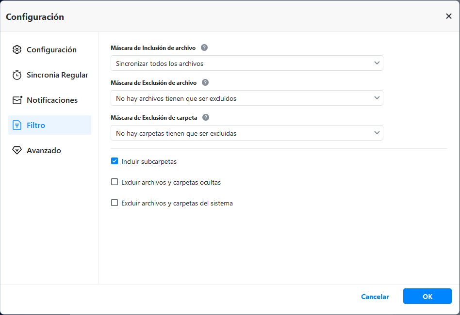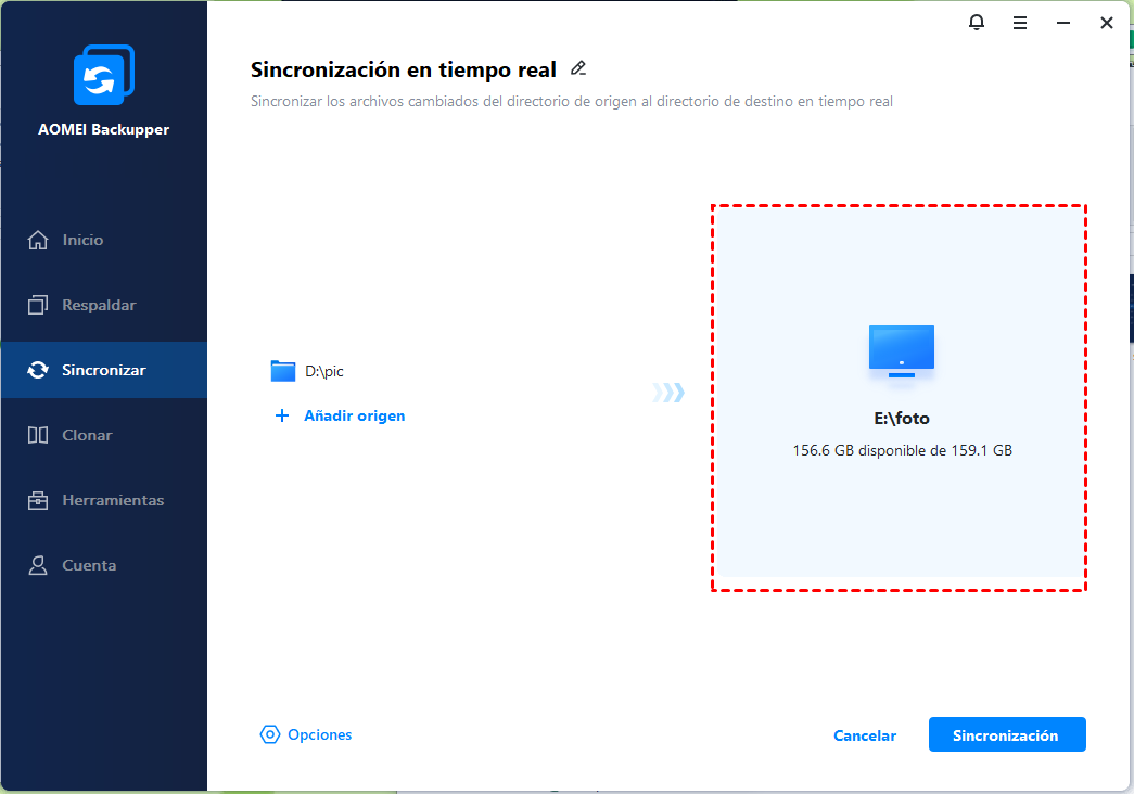 - Ofrece cuatro modos de sincronización para ayudarle a realizar copias de seguridad de datos. Son Sincronización básica, Sincronización mirror, Sincronización bidireccional y Sincronización en tiempo real.