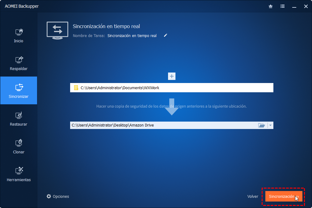Con la función de sincronización en tiempo real de AOMEI Backupper, puede realizar una protección continua de datos fácilmente. Una vez que configure la tarea de sincronización en tiempo real, el programa monitoreará en tiempo real el directorio de origen que necesita sincronización. Si ocurre algún cambio en algún archivo o carpeta en el directorio de origen, el programa los sincronizará inmediatamente y proporcionará una copia de seguridad en tiempo real de sus datos.