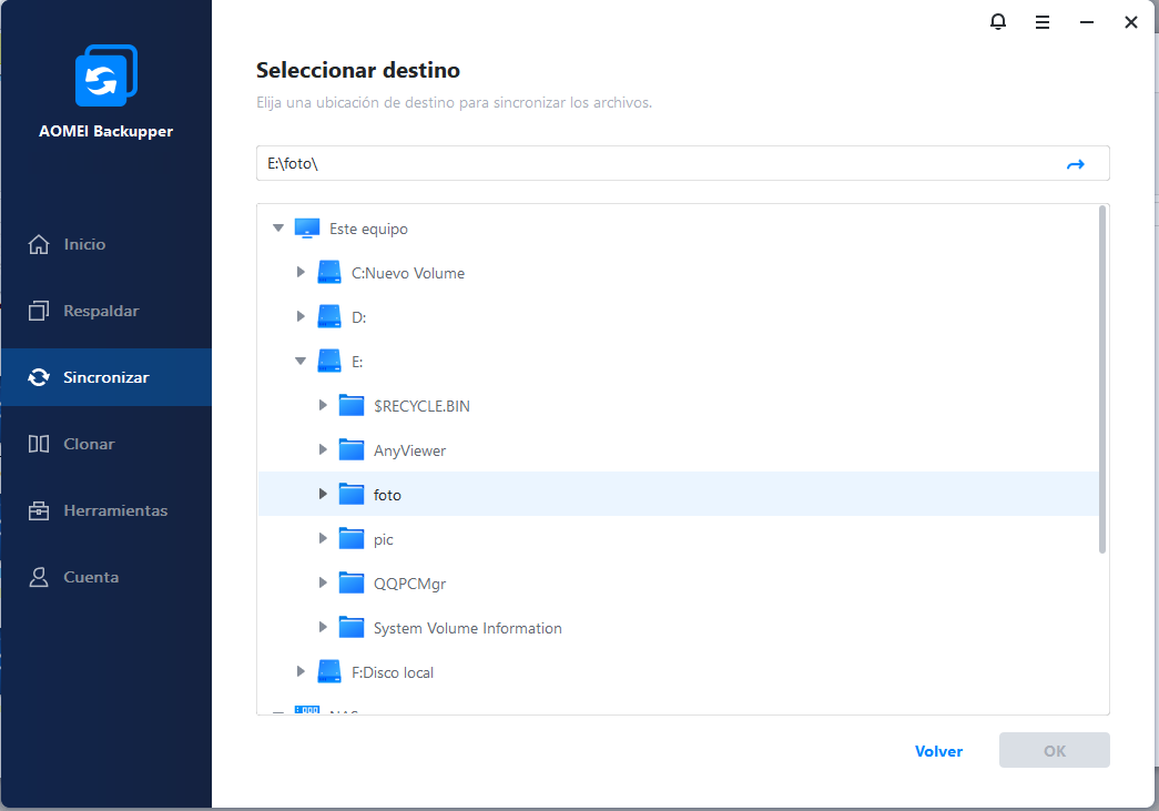 AOMEI Backupper aún puede sincronizar la carpeta local con Google Drive, OneDrive, unidad de red o NAS. Asimismo, puede sincronizar archivos a un disco duro externo, unidad USB y más.