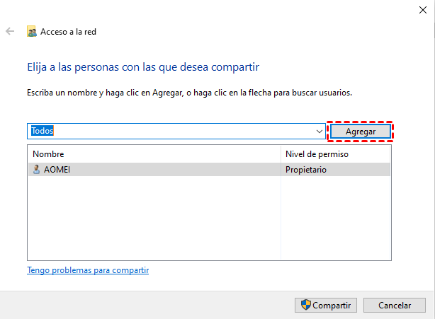 Paso 2. Cambia a la pestaña Compartir y haz clic en Compartir... para dar acceso a la red a los grupos de usuarios que desees. Para permitir que todos los usuarios de la red accedan a esta carpeta, sólo tienes que elegir Todos y hacer clic en Agregar > Compartir.