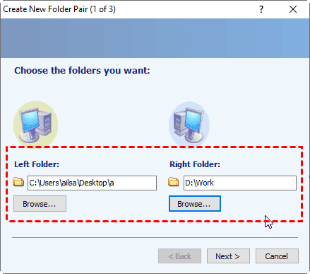 Paso 2. Elija la carpeta de origen y la carpeta de destino en el mismo ordenador haciendo clic en Browse (Navegar) de Left Folder y Right Folder por separado. Y haga clic en Siguiente > (Next >).