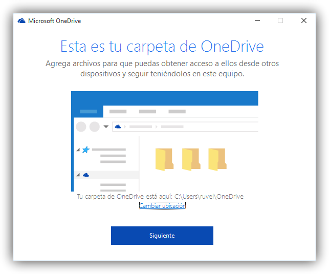 5. En la pantalla de Esta es tu carpeta de OneDrive, haga clic el vínculo "Cambiar ubicación". Luego seleccione el lugar nuevo de carpeta de OneDrive y haga clic en Utilizar esta ubicación.