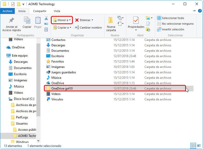 3. Abra Explorador de Archivos y encuentre su caperta de OneDrive. A continuación haga clic en el botón "Mover a" y seleccione una carpeta de la unidad de disco duro externa.