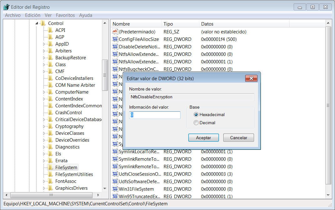 3. Expande el Archivo de sistema a la ventana derecha, y busca la opción llamada "NtfsDisableEncryption". Double clic en ella, y configurar su valor a 0.