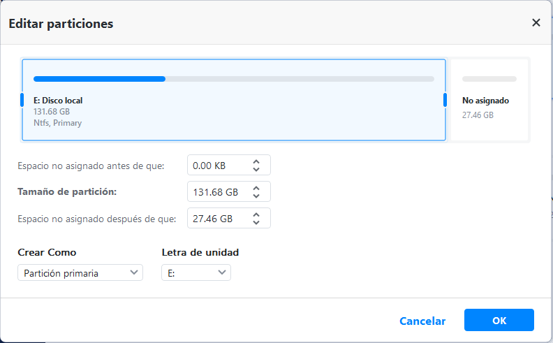4. (Opcional) En la página Resumen de la operación, haga clic en "Editar partición", coloque el puntero del ratón en el borde de la partición de destino y arrastre el borde para ajustar el tamaño de la partición. Aquí también puede elegir el tipo de partición y cambiar la letra de la unidad para la partición de destino.