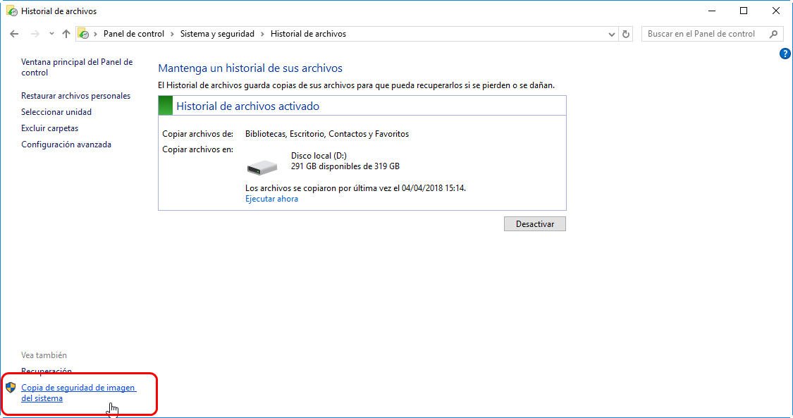 - A través del Historial de Archivos: Vaya al "Panel de control", seleccione "Historial de archivos" y luego haga clic en "Copia de seguridad de la imagen del sistema" en la esquina inferior izquierda.