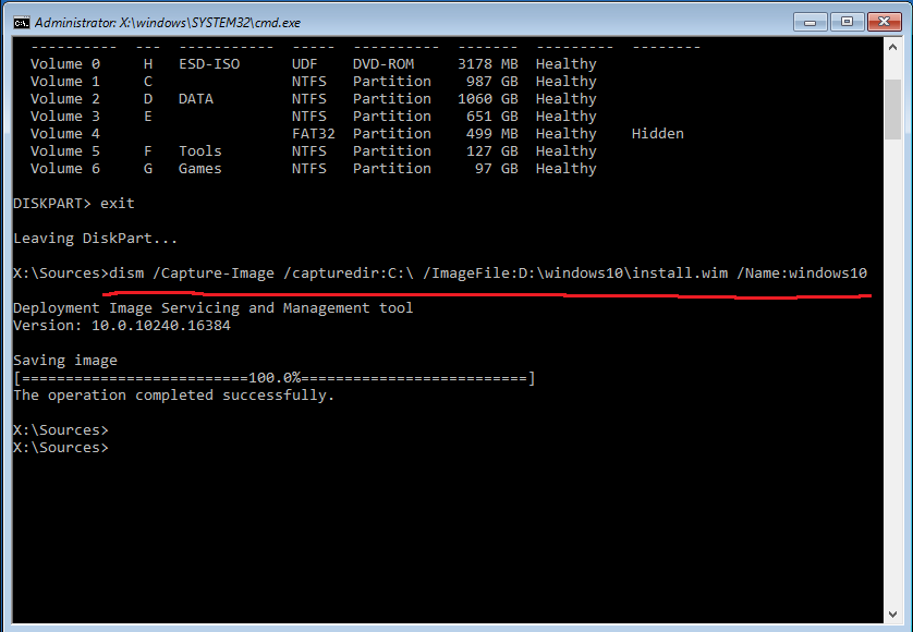 Para crear un archivo ISO de Windows 10/11 desde tu sistema operativo actual, puedes utilizar la función integrada DISM para capturar la imagen de Windows en el entorno de recuperación. A continuación, tomaré Windows 10 como ejemplo.