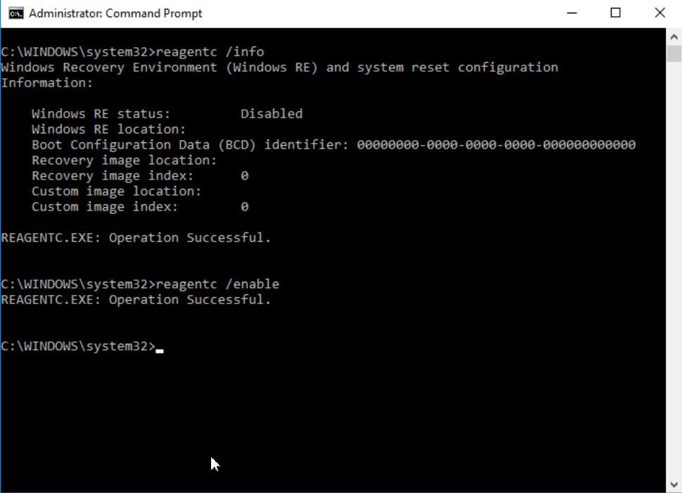 Puedes ejecutar el comando "reagentc/info" en el símbolo del sistema elevado para verificar el estado de la recuperación.