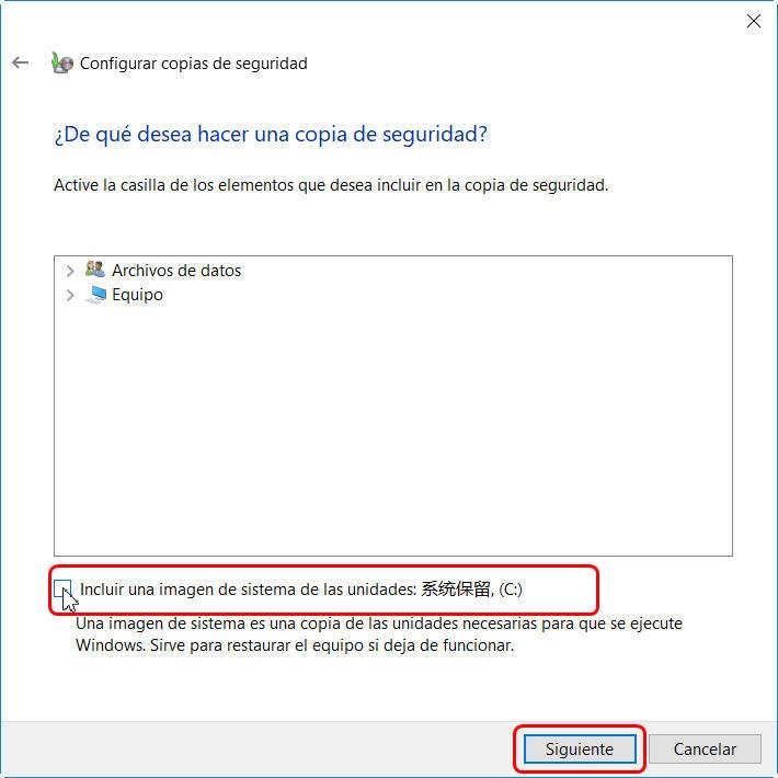 Nota: Si sólo quiere hacer una copia de seguridad del perfil del usuario, desmarque la opción "Incluir una imagen del sistema".