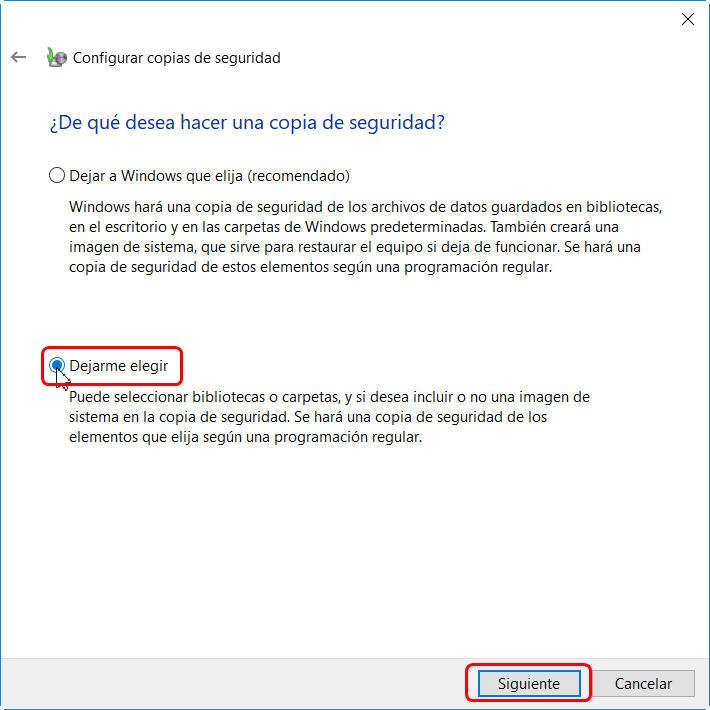 Nota: Si ya has configurado un programa de copias de seguridad, verás una ventana diferente. En ese caso, haz clic en el botón Opciones y elige Cambiar la configuración de la copia de seguridad para realizarla.