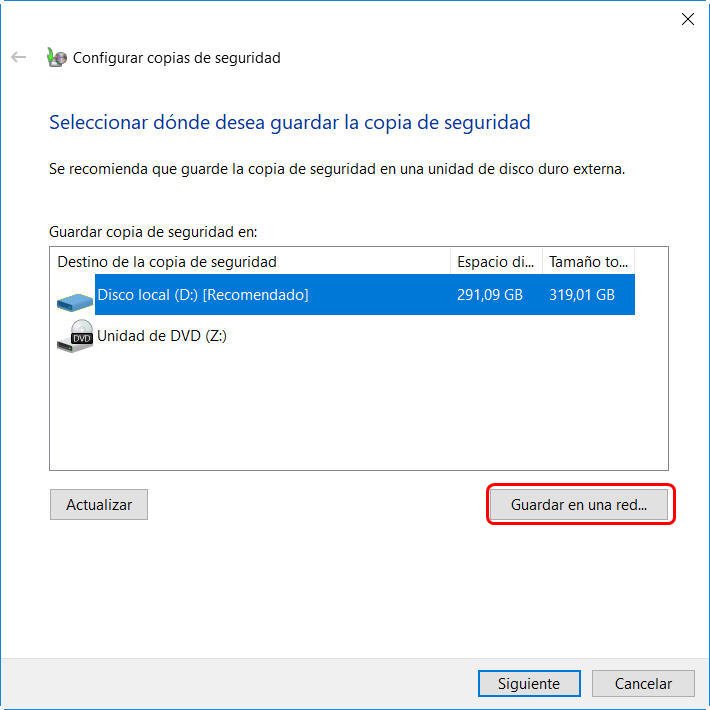 2. Seleccione la ubicación para guardar la copia de seguridad del perfil de usuario de Windows 10 y haga clic en Siguiente para continuar. Si quieres hacer una copia de seguridad del ordenador en un disco duro externo en Windows 10, selecciona la unidad externa en este paso.