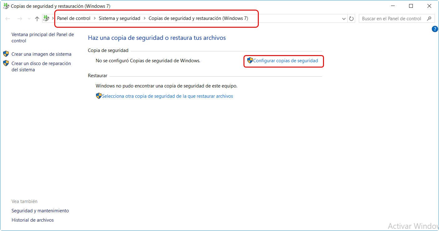 1. Vaya a Panel de control > Sistema y seguridad > Copia de seguridad y restauración (Windows 7). A continuación, haga clic en Configurar copia de seguridad en la ventana Copia de seguridad y restauración (Windows 7).