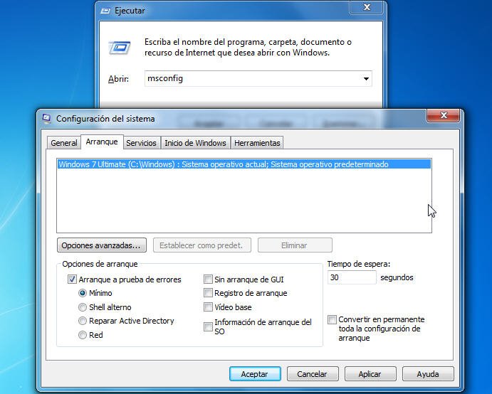 También puede iniciar en Modo Seguro usando la herramienta de Configuración del sistema. Para hacerlo, escribe "msconfig" en el cuadro Ejecutar. A continuación, en la pestaña de Arranque, hace clic en "Arranque a prueba de errores".