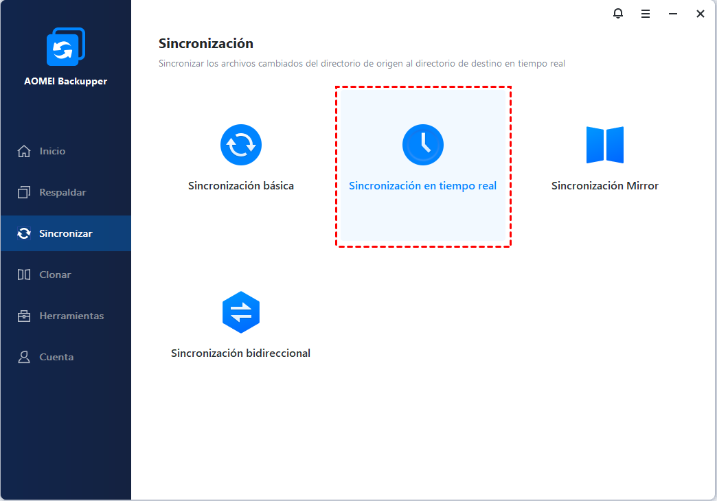 - Ofrece cuatro modos de sincronización para diferentes necesidades: sincronización básica, sincronización mirror, sincronización en tiempo real y sincronización bidireccional. Para sincronizar archivos modificados de inmediato, puede elegir la sincronización en tiempo real.