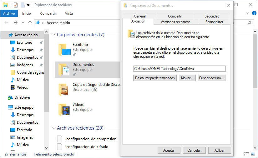 Abre el Explorador de Archivos, hace clic en Documentos, y elige Propiedades. Luego presiona Ubicación y Mover a. En la ventana que se aparece selecciona OneDrive, después selecciona la carpeta Documentos dentro.